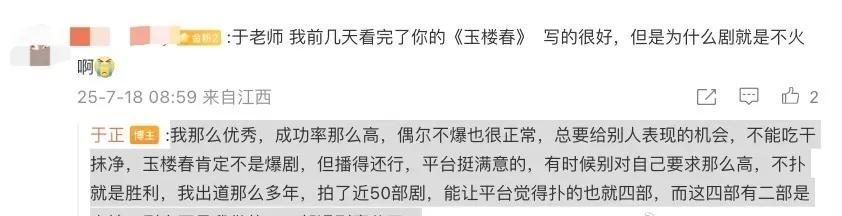 事情是这样的,有网友追着问于正:“《玉楼春》剧本明明写得那么带感,为啥没爆啊?”于正这回应可太“于式自信”了:“我拍了快50部剧,成功率摆在那儿!偶尔不爆很正常,总不能把红利全吃了吧?《玉楼春》平台满意,不扑就是赢!”还耿直爆料,自己职业生涯就四部扑剧,两部是人情局,两部是遇事儿了,这坦诚度也是没谁了。