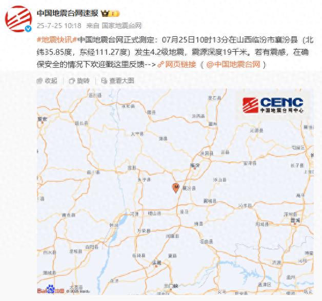 中国地震台网正式测定:07月25日10时13分在山西临汾市襄汾县(北纬35.85度,东经111.27度)发生4.2级地震,震源深度19千米。