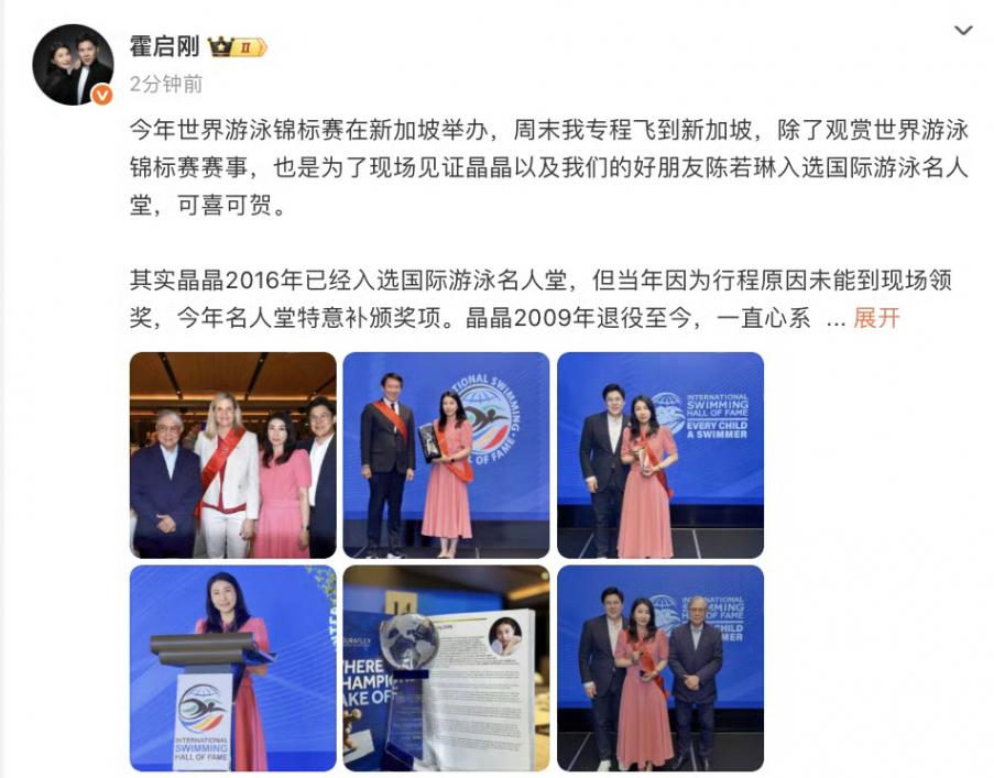 这次霍启刚是专程从香港飞到新加坡,全程陪伴妻子的,他在社交平台上发文说,这次来除了看比赛之外,更重要的是见证郭晶晶和陈若琳一起入选名人堂的荣耀时刻。