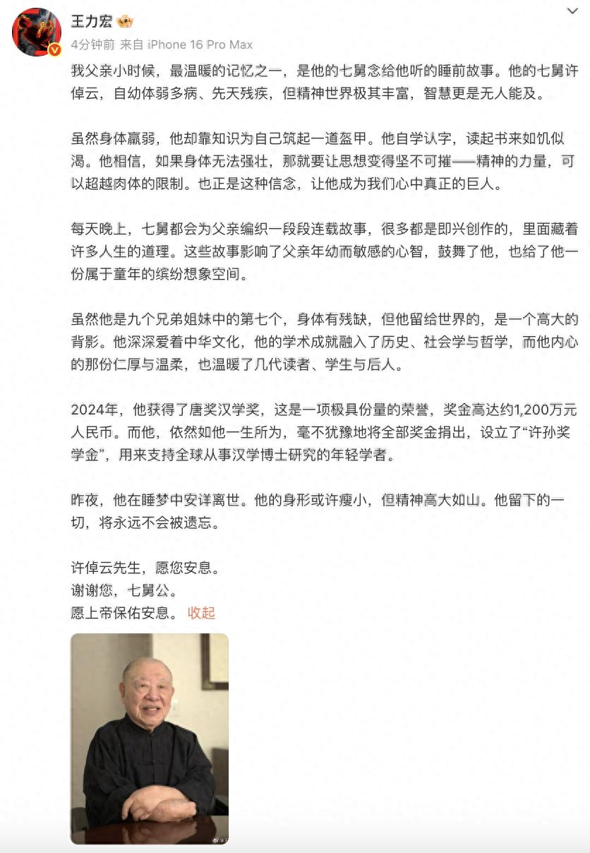 据北京日报,2024年,许倬云接受采访。当主持人问及最重要的遗憾时,许倬云沉思8秒后,他给出了这样的问答:“但悲不见九州同。”