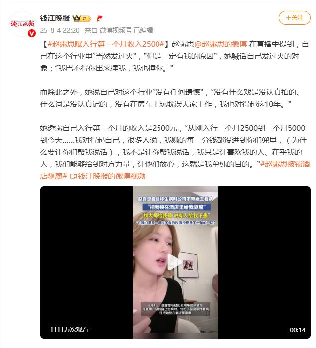 赵露思在直播中直言:“从刚入行一个月2500到一个月5000到今天……我对得起自己。”但网友立刻扒出2016年的薪资对比——银行实习生月薪400元、重庆普通文职800元起步,甚至外卖员月入过万都算高薪。有评论犀利吐槽:“她现在的片酬怕是2500万的零头都不止,现在来卖‘打工人’人设?”