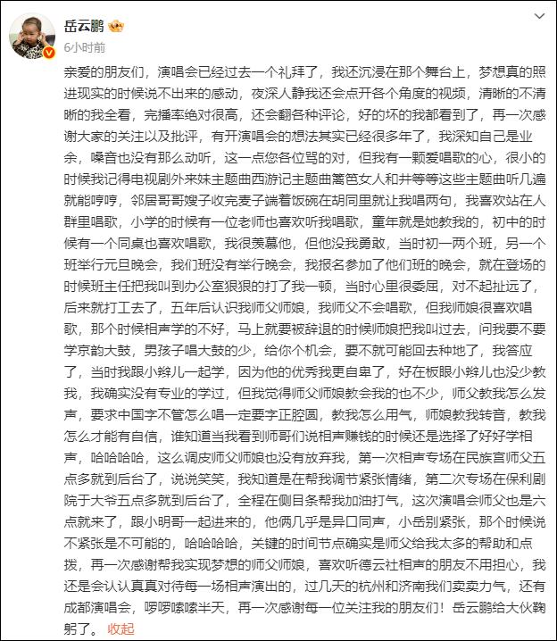 8月5日凌晨,相声演员岳云鹏发长文,回顾自己开演唱会经历。