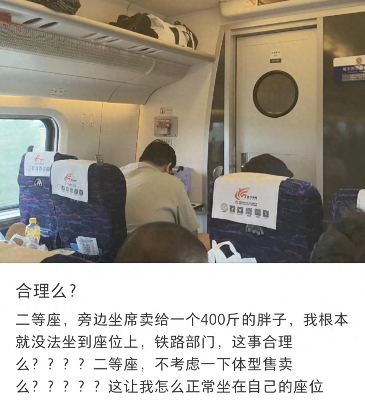最近有网友吐槽,她坐高铁二等座,邻座是位约400斤的大哥,体型宽得把她的座位挤得只剩条缝,“根本坐不进去”,还拍了照问:“铁路售票就不能考虑考虑体型差异吗?”