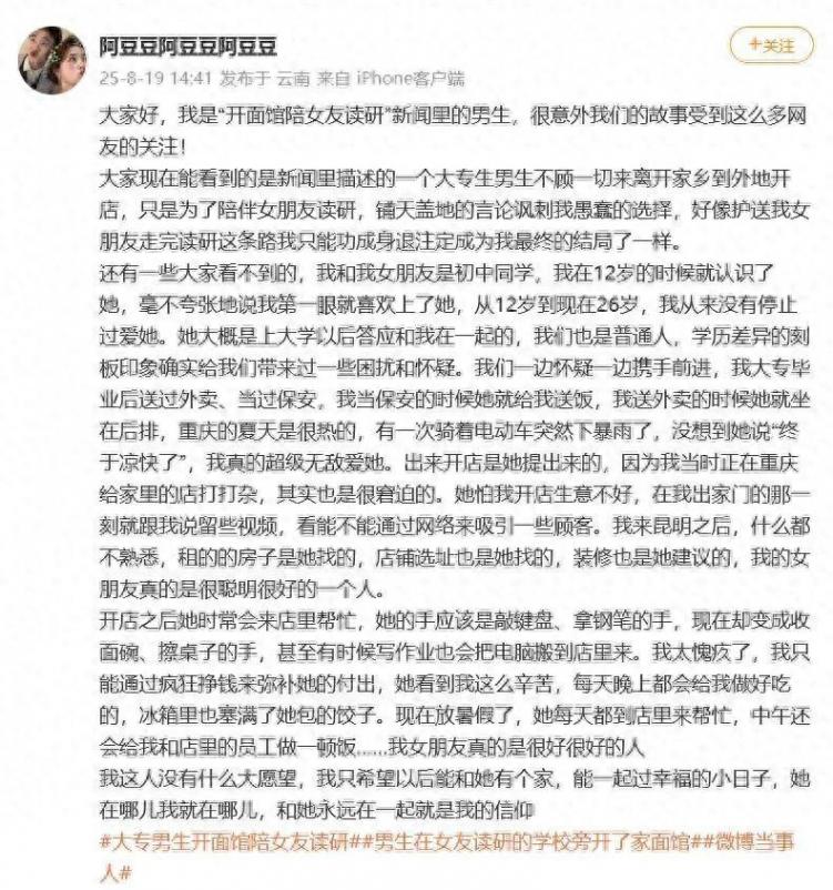 这两天刷到一条暖心新闻:重庆99年大专生小张,背起行囊跑到昆明,一边陪女友读研,一边把重庆小面馆从0做起。他在主页写得直白:“梦想是毕业后娶她。”最开始,外界盯着的都是“学历差异”,嘲讽的、打问号的,不少。