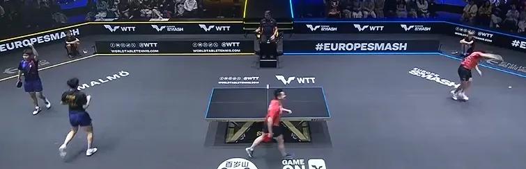 第一局,11/7,开局比较胶着,双方都有失误。在比分6:6平后,我们连拿2分,比分来到8:6打开了局面,很快11:7先下一城。在中段以后,我们两小将慢慢找回了状态,两人衔接配合得非常好。