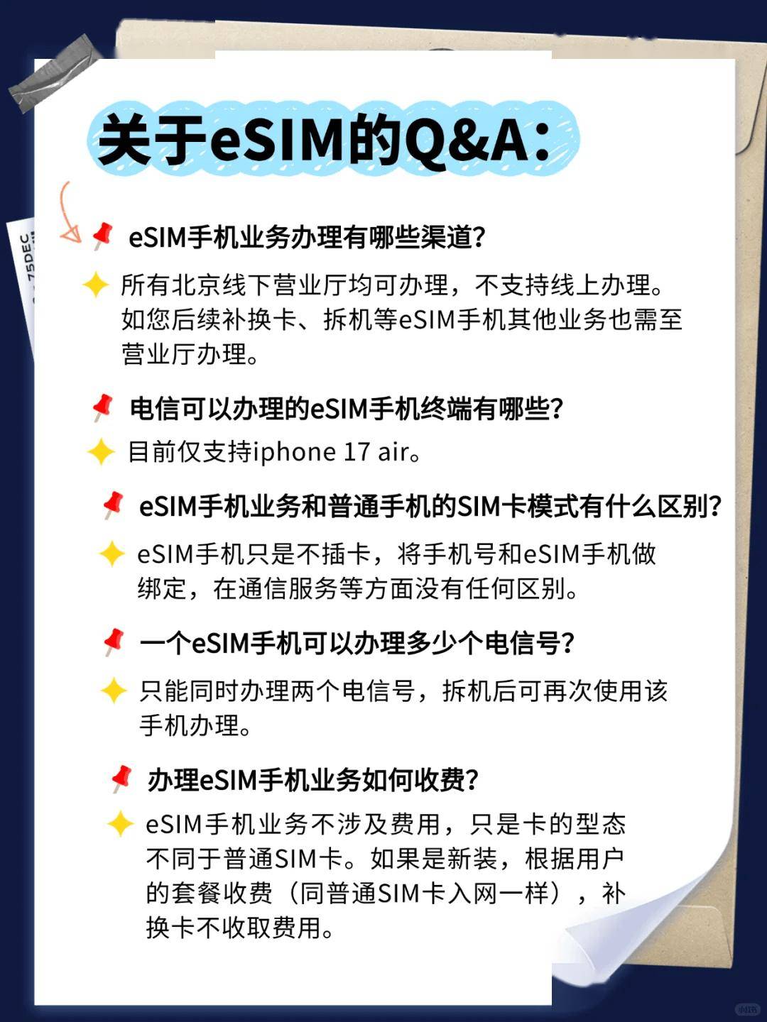 9 月 10 日消息,北京电信今晚通过官方小红书账号宣布,其已经具备 eSIM 开通能力,9 月 19 日随 iPhone Air开售同步上线体验,套餐资费、权益不变。