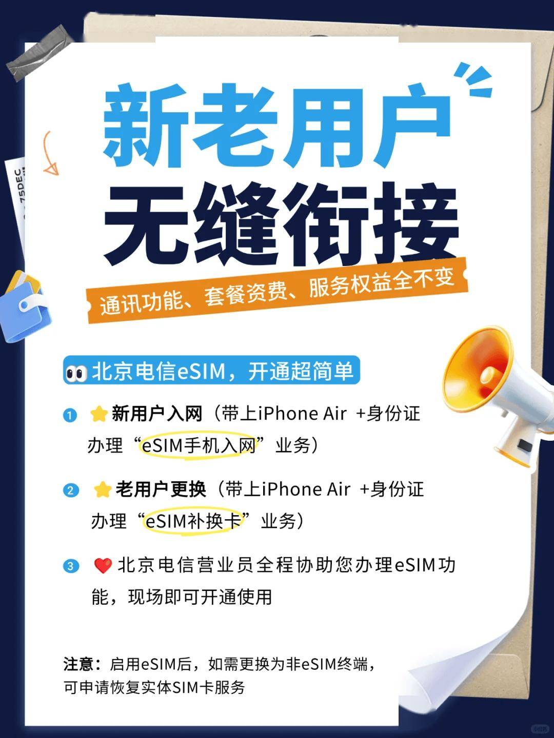 - 老用户更换:带上 iPhone Air + 身份证,办理“eSIM 补换卡”业务