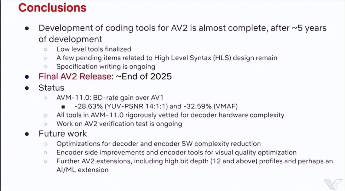 目前,所有的AV2编码工具均已通过硬件效率验证,下一步一重点是编码器优化,以及针对更高位深度、AI辅助配置文件的扩展开发。