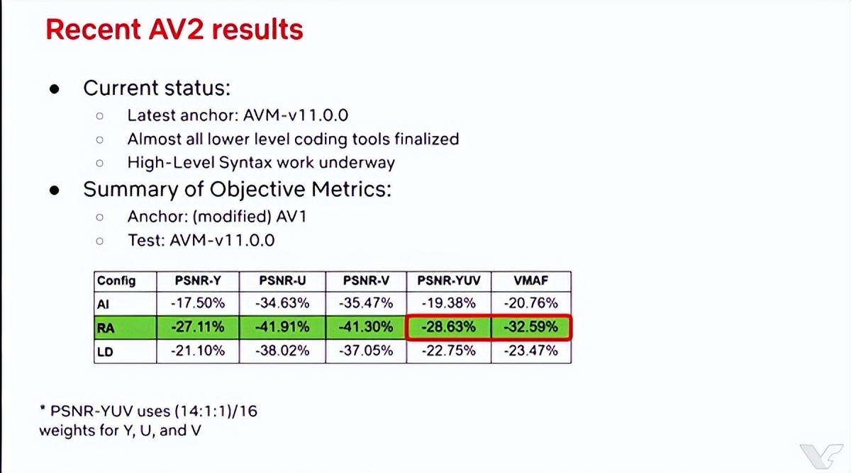 来自Netflix的AOM联合主席、研究科学家Andrey Norkin确认,最新测试表明,AV2相比于AV1 PSRN-YUV(14:1:1)下的码率降低了28.63%,VMAF下更是降低了多达32.59%,但是视频质量基本相同。