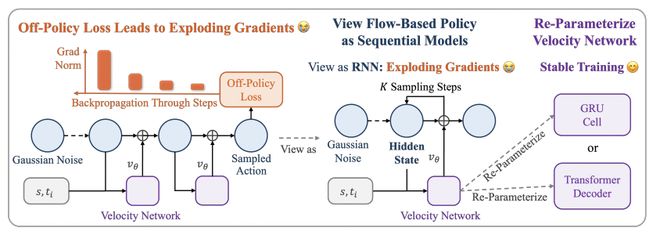 流策略(Flow-based policy)最近在机器人学习领域十分热门:它具有建模多峰动作分布的表达能力,且比扩散策略更简洁好用,因此被广泛应用于先进的 VLA 模型,例如 π_0、GR00T 等。想要跳出数据集的约束,进一步提高流策略的性能,强化学习是一条有效的路,已经有不少工作尝试用 on-policy 的 RL 算法训练流策略,例如 ReinFlow [1]、 Flow GRPO [2] 等。但当我们使用数据高效的 off-policy RL(例如 SAC )训练流策略时总会出现崩溃,因为流策略的动作经历「K 步采样」推理,因此反向传播的「深度」等于采样步数 K。这与训练经典 RNN 时遇到的梯度爆炸或梯度消失是相同的。