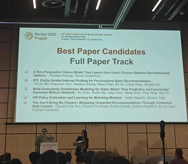在不久前于布拉格落幕的推荐系统顶会 RecSys 2025 上,一篇来自小红书推荐算法团队的论文《Multi-Granularity Distribution Modeling for Video Watch Time Prediction via Exponential-Gaussian Mixture Network》引发了现场技术人员和专家们的重点关注和集体热议。这篇论文最终从全球数百篇顶尖研究中脱颖而出,斩获全球仅五篇的「最佳论文提名 (Best Paper Candidates)」。