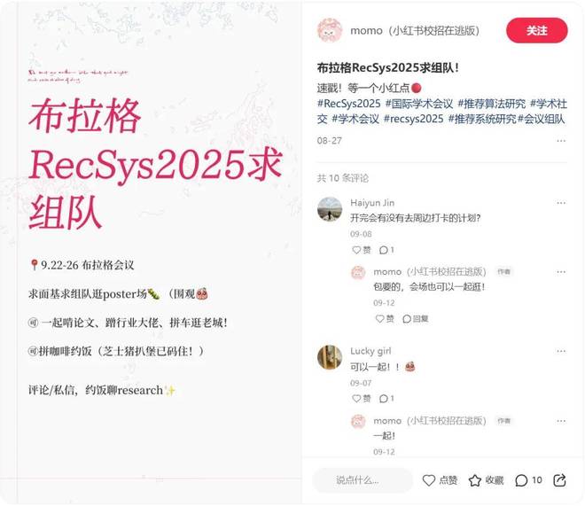 一位参会者分享了一个令他惊叹的体验:他从美国飞抵布拉格,打开小红书,APP 不仅迅速为他推送了精准的本地内容,更神奇的是,他还刷到了同样来参加 RecSys 会议的其他人发的帖子,并因此在线下认识了新朋友。这种精准捕捉用户即时场景与身份的能力,让这些本身就是推荐系统专家的用户感到非常好奇和赞叹。