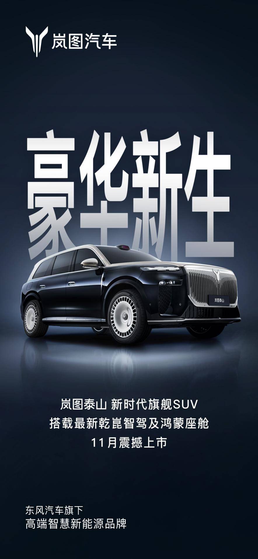 10月20日,正式宣布,新时代旗舰SUV——将于11月重磅上市。作为岚图年度压轴“豪”车,岚图泰山拥有与问界M9、尊界S800“智能同源”的尖端技术,搭载顶配版华为乾崑ADS 4与鸿蒙座舱5,将成为旗舰“9系”豪华SUV市场极具竞争力的产品。