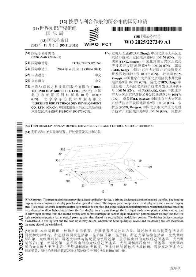 根据企查查数据显示京东方A(000725)公布了一项国际专利申请,专利名为“抬头显示装置、行驶装置及其控制方法”,专利申请号为PCT/CN2024/090740,国际公布日为2025年11月6日。
